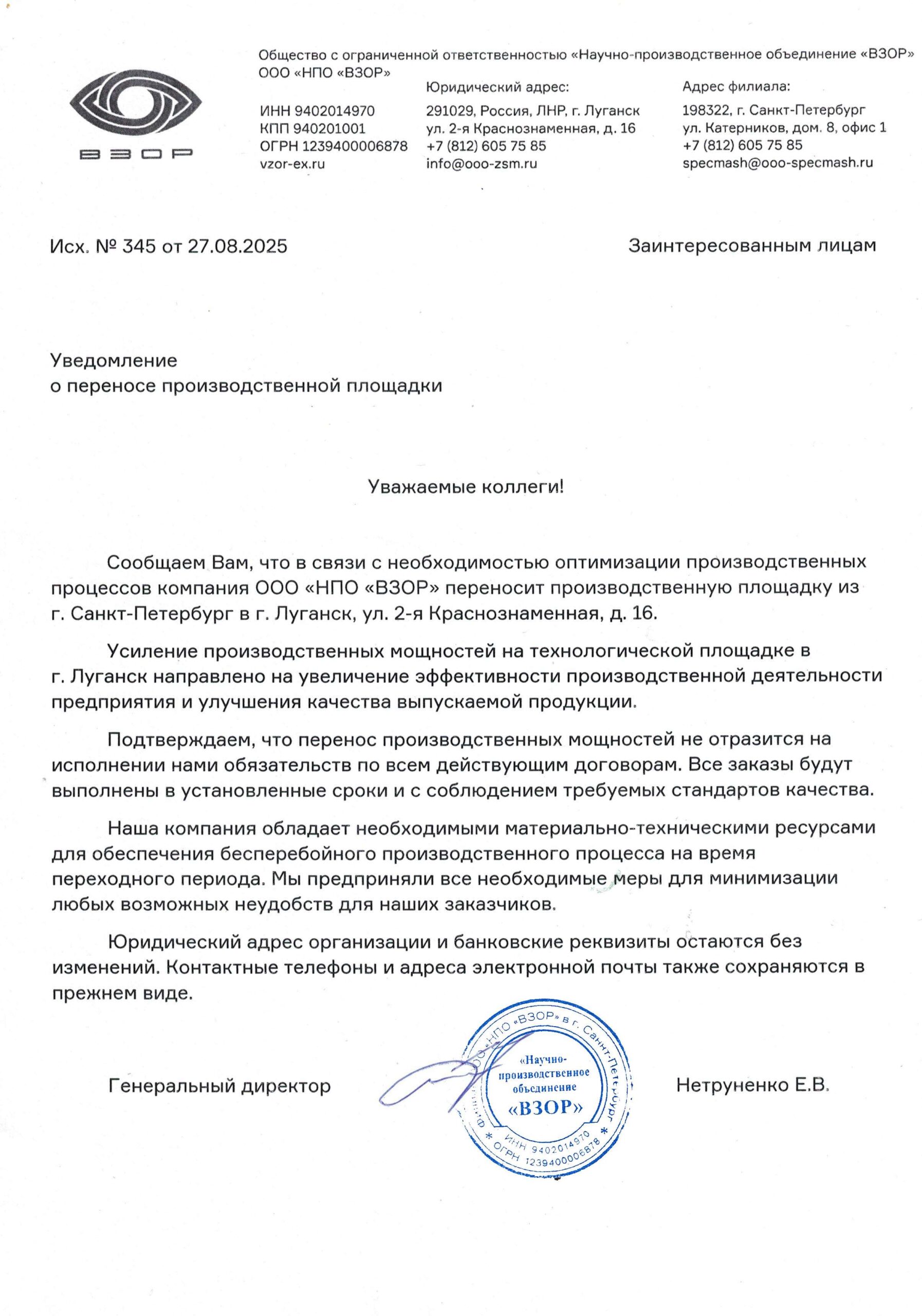 НПО ВЗОР переносит производственную площадку в Луганск. Перенос обусловлен необходимостью оптимизации производственных процессов и повышения эффективности деятельности предприятия. Новое расположение позволит обеспечить лучшие условия труда сотрудников и повысить качество выпускаемой продукции.