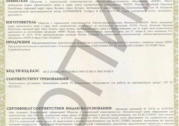 Сообщаем о получении нового сертификата соответствия ТР ТС 012/2011 на взрывозащищенные устройства освещения и источники бесперебойного питания. Продолжаем активную работу по расширению линейки сертификатов соответствия на оборудование нашего производства.