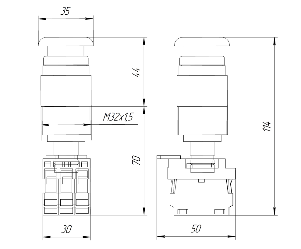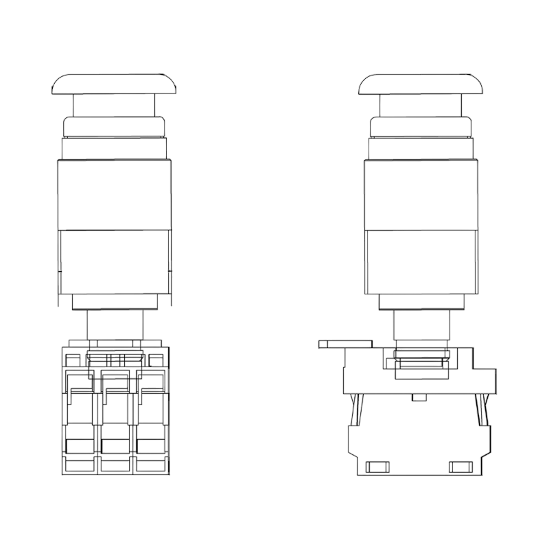 Кнопки конструктивно представляют собой сборку из контактного блока и кнопочного элемента. Контактный блок имеет корпус из полиамида и смонтированные внутри подпружиненные нажимные элементы и клеммные зажимы. Кнопочный элемент представляет собой подпружиненный нажимной элемент, смонтированный в корпусе из полиамида. Материал уплотнительных колец – силикон. Конструктивно нажимная головка кнопки может быть выполнена в различных исполнениях. Контактный блок имеет различные электрические схемы.