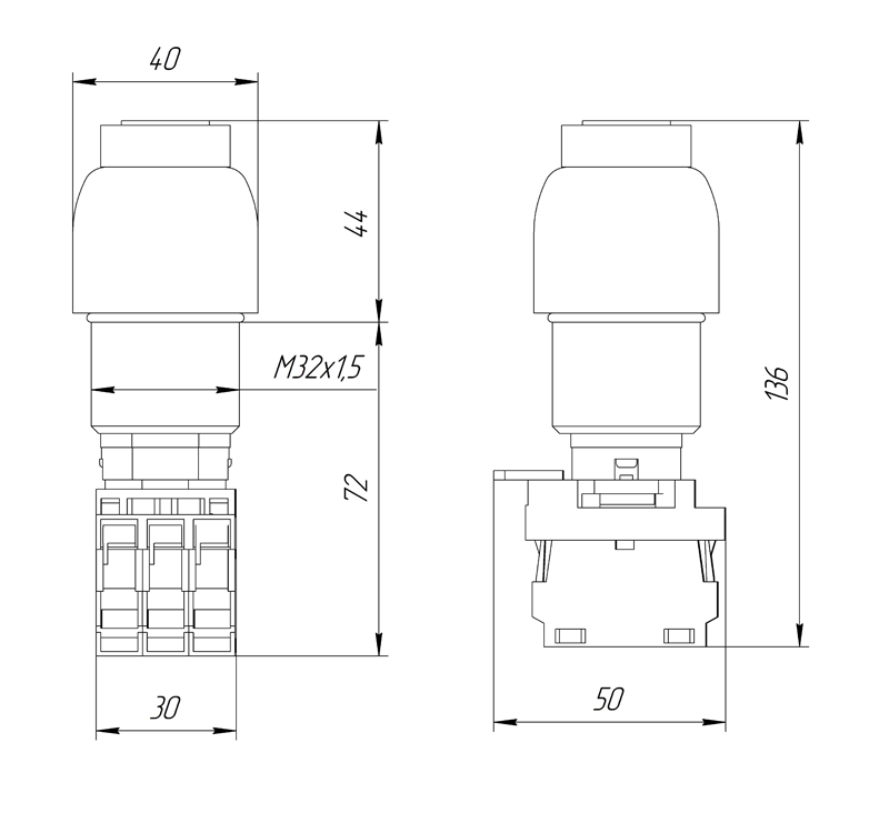 Кнопки конструктивно представляют собой сборку из контактного блока и кнопочного элемента. Контактный блок имеет корпус из полиамида и смонтированные внутри подпружиненные нажимные элементы и клеммные зажимы. Кнопочный элемент представляет собой подпружиненный нажимной элемент, смонтированный в корпусе из полиамида. Материал уплотнительных колец – силикон. Конструктивно нажимная головка кнопки может быть выполнена в различных исполнениях. Контактный блок имеет различные электрические схемы.
